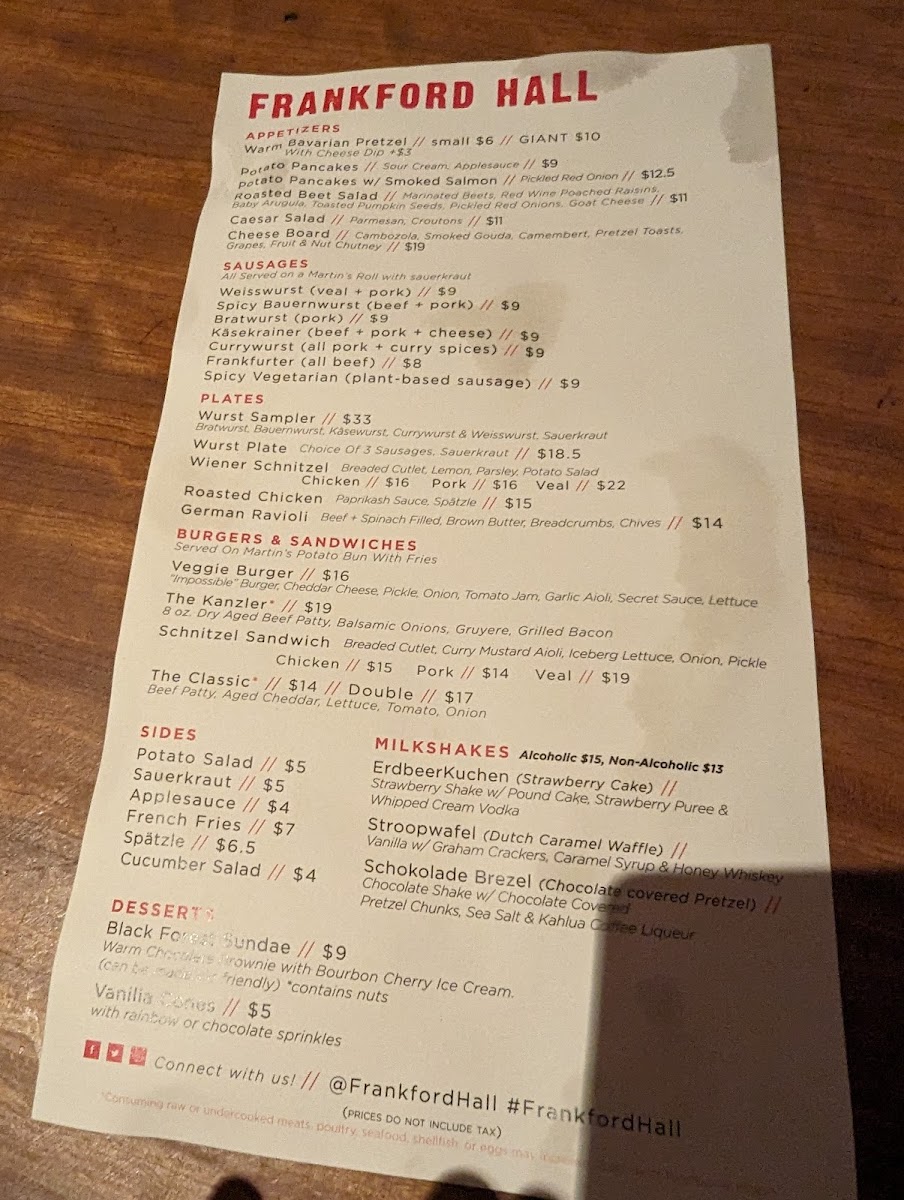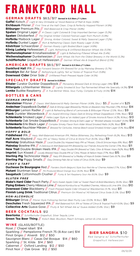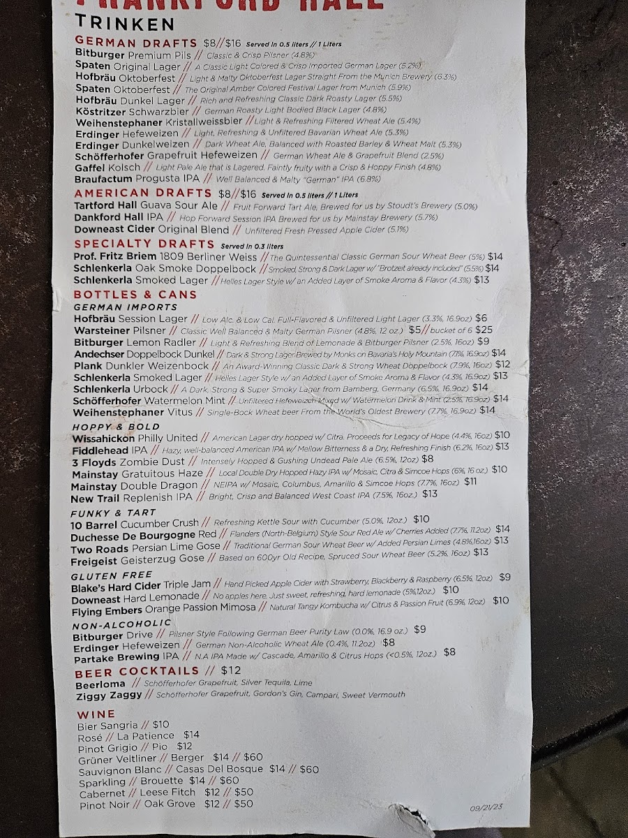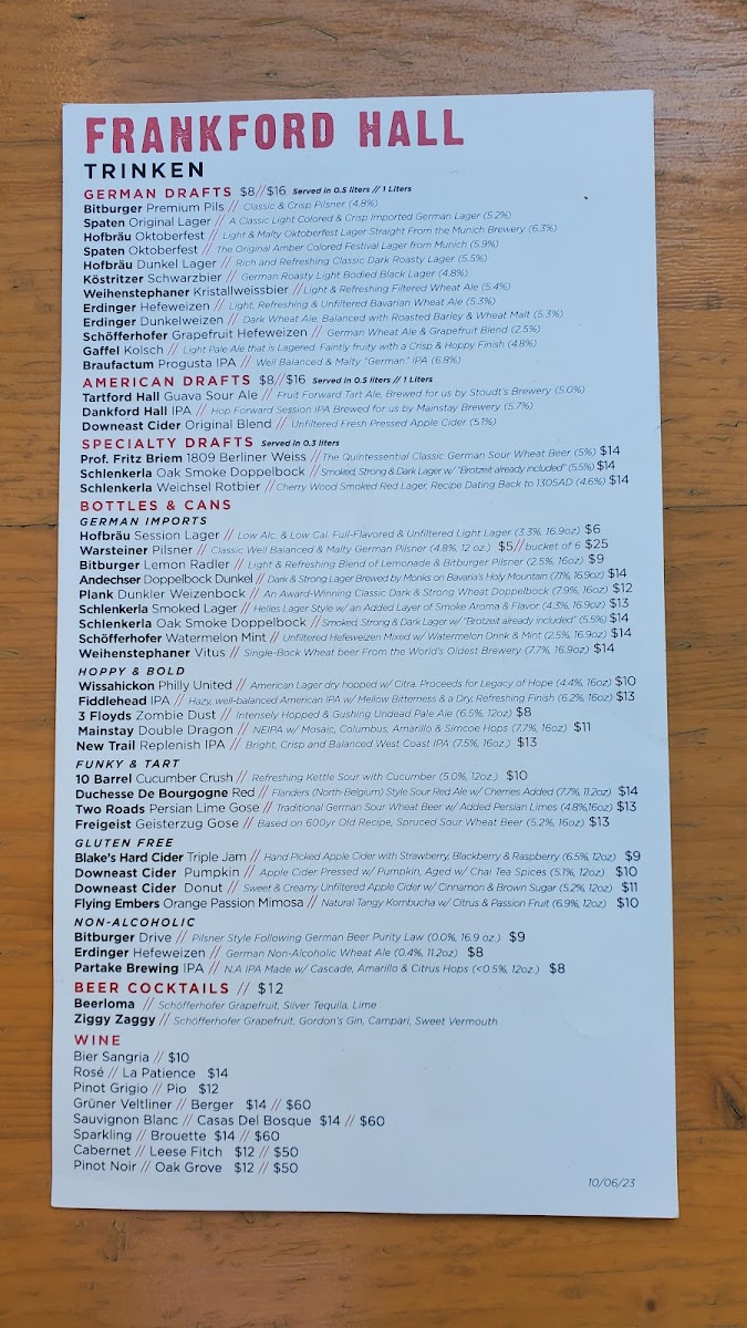 Welcome to Frankford Hall, a vibrant German beer garden located at 1210 Frankford Ave in Philadelphia. Known for its lively atmosphere, Frankford Hall offers an inviting space perfect for gatherings, complete with a sunny courtyard and community tables. The menu showcases traditional German fare paired with an impressive drink selection.